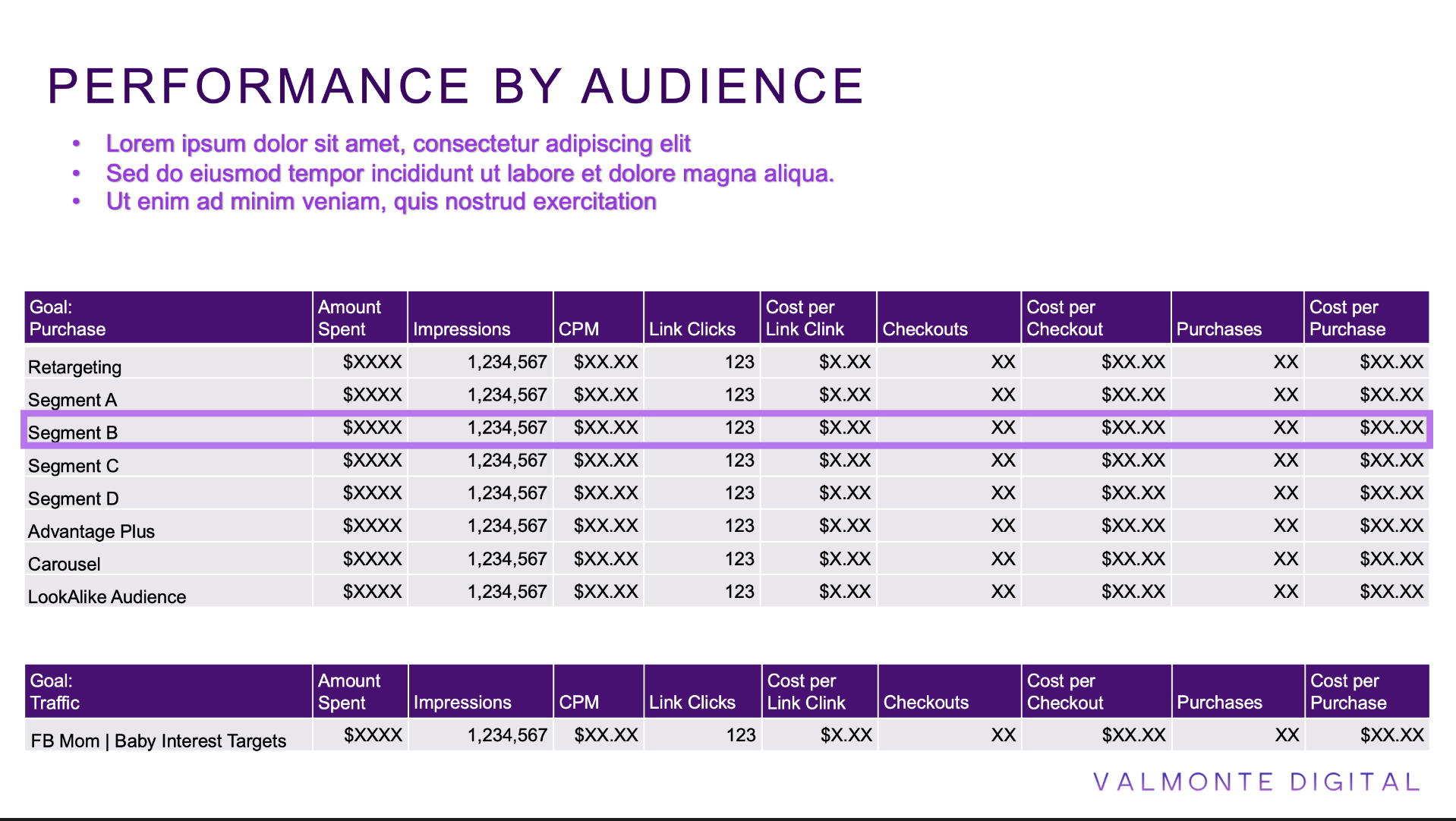 Valmonte Digital set up A/B audience tests with the goal of Conversions to identify which audiences drove the most cost efficient sales. We utilized a manual broad Facebook target, Advantage +, What to Expect third trimester data, and What to Expect new moms of 0-3 month olds data.